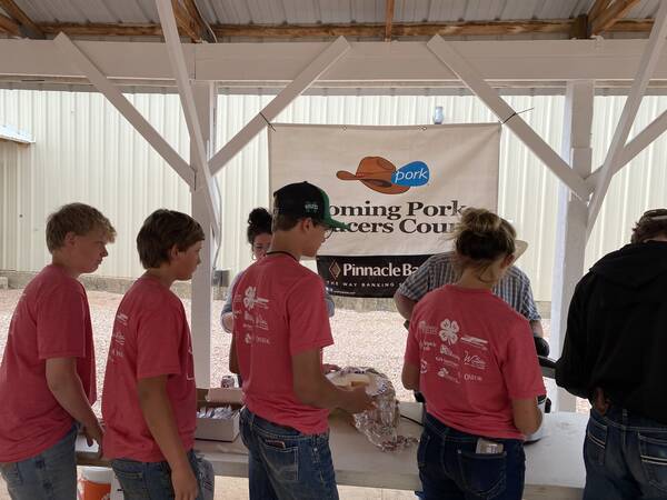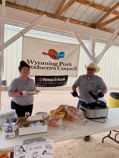 Jim and Kristen served lunch at the 307 Northeast Livestock Show Clinic 2023 in Sundance. The Wyoming Pork Producers Council supplied the pork loin. Jim smoked it and Kristen and Jim served over 100 kids and adults.